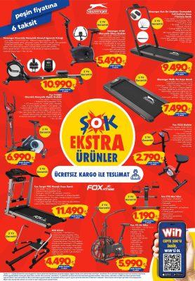 Şok Aktüel kataloglarında fırsatlar bitmiyor. Şok 10 Şubat 2024 kataloğunda yer alan şok ekstra ürünler isimli peşin fiyatına 6 taksit avantajı ve ücretsiz kargo ile teslimat fırsatına sahip sınırlı stok adetleri ile dikkat çeken ürünler resmen açıklandı. Pek çok sporcu ve egzersiz ekipmanının da harika fiyatlar sunacak olan bu katalog sayfasında ilk olarak Slazenger markalı şu ürünler dikkat çekiyor: manyetik dirençli egzersiz küreği 80 adet stok sınırı ve peşin fiyatına 6 taksit avantajıyla 10.990 liradan satılıyor. Manyetik dikey bisiklet 120 adet stok sınırı 2 yıl garantisi ile 5.490 liradan satışa çıkıyor. Run On uzaktan kumandalı full katlanır koşu yürüyüş bandı 150 adet stok sınırı ve 2 yıl garantisiyle 9.490 TL fiyata sahip olarak sizleri bekliyor.