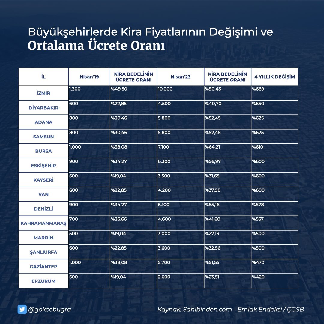 Türkiye genelinde kira artış oranlarını karşılaştıran İBB Genel Sekreter Yardımcısı Buğra Gökce yaşanılan konut krizinin düşünüldüğünden daha derin olduğunu vurguladı. Gökce, Nisan 2019 - 2023 döneminde büyükşehirlerdeki kira bedelinde ortalama artış oranının yüzde 697 olduğunu söyledi.