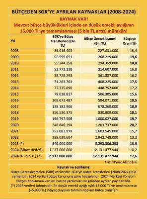 Aziz Çelik, "Mevcut bütçe büyüklükleri içinde bile en düşük yaşlılık (emekli) aylığının 15.000 TL'ye tamamlanması ve aylıklarda 5 bin TL artış mümkün!" diye belirtti.