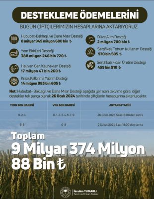 Tarım ve Orman Bakanı İbrahim Yumaklı, 9 milyar 374 milyon lira tarımsal destekleme ödemesinin çiftçilerin hesaplarına aktarıldığını açıkladı. Çiftçilere en çok hububat ve baklagil desteği ile yem bitkileri desteği sağlandı.