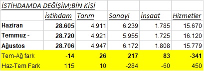 - Ağustos ayında istihdamın sektörel dağılımı da iş gücü piyasasında genele yaygın bir toparlanma olmadığını gösteriyor. İstihdamı en çok destekleyen hizmetler sektöründe bıraktık yeni istihdam yaratılmasını, mevcut işler de kaybedilmiş.