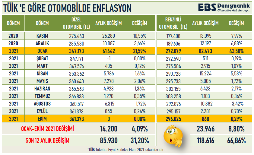 Erol Şahin’in paylaşımı şöyle: “Otomobil fiyatları artmamış ki! TÜİK’e göre 2021 ilk 10 aylık dönemde, dizel otomobil fiyatı %4,09, benzinli otomobil fiyatı %8,8 artmış! Ekim ayında ise hiç artmamış! Kurun tavan yaptığı, resmi enflasyonun %20, gerçeğinin %45 olduğu bir ülkede buna inanalım mı!?”