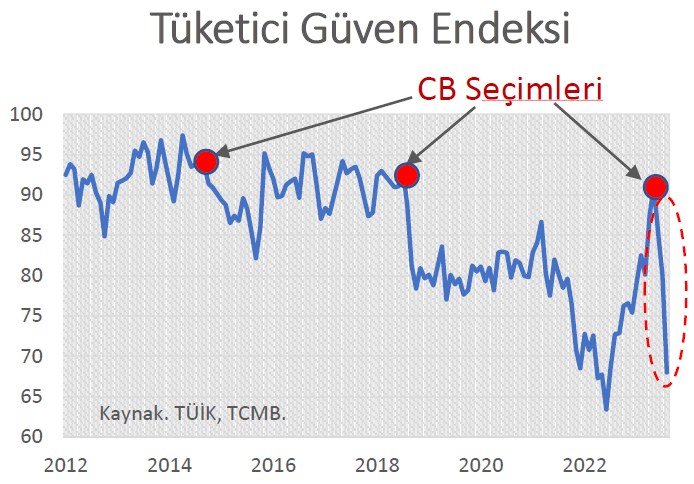 Son 5 yıl ise ekonomide "faiz sebep, enflasyon sonuç" söylemlerinin gölgesinde kur krizi yüksek enflasyon ve hayat pahalılığı ile geçti. Endeks 2022'de 64 puanla dibi gördü. Seçimlere doğru yükselişe geçen tüketici güveni yeniden 90'lara geldi ancak bu kez diğer iki seçimde olduğundan çok daha büyük bir düşüş kaydetti. Seçimlerden önce 90'lı seviyelerden seyreden tüketici güveni, ekonomide "rasyonele dönüş" vaadine rağmen 12,1 puanla aylık bazdaki en sert düşüşü yaşadı.