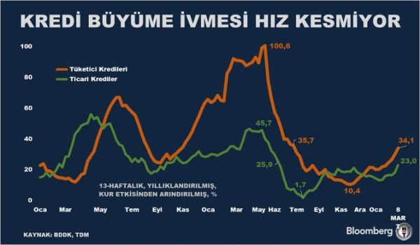 BDDK verilerine göre, tüketici kredilerinde yüzde 34,1 büyüme gerçekleşti. Ticari kredilerdeki büyüme de yüzde 23 olarak kaydedildi.