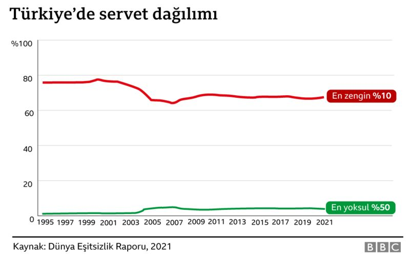 Bugün, en yoksul yüzde 50, ortadaki yüzde 40 ve en üstteki yüzde 10 sırasıyla toplam milli servetin yüzde 4’ünü, yüzde 29’unu ve yüzde 67’sini elinde tutuyor.