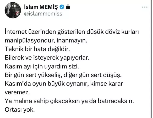"İnternet üzerinden gösterilen düşük döviz kurları manipülasyondur, inanmayın. Teknik bir hata değildir. Bilerek ve isteyerek yapıyorlar." ifadesini kullanan uzman isim paylaşımına şu notu düştü: