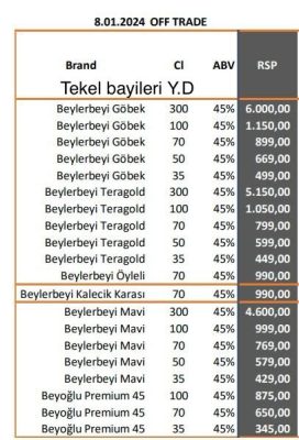 Tekel Bayileri Yardımlaşma Derneği (TBYD) Başkanı Erol Dündar'ın paylaştığı zamlı listeye göre, grubun en pahalısı 300'lük rakı 6 bin TL olurken en ucuzu 35'lik rakı 345 lira oldu. Zamlarla birlikte en düşük 70'lik rakı fiyatı ise 650 lira olarak belirlendi.