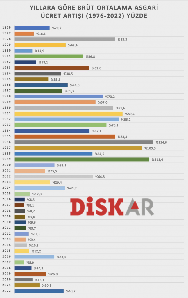 DİSK Araştırma Merkezi: Asgari ücretteki artışın son 45 yılın en yüksek artışı olduğu iddiası doğru değil! Asgari ücrette önemli olan artış oranı değil, alım gücü ve geçinmeye yetip yetmediğidir. 1976-2022 yılları arası ortalama brüt asgari ücret artışları aşağıdaki gibidir.
