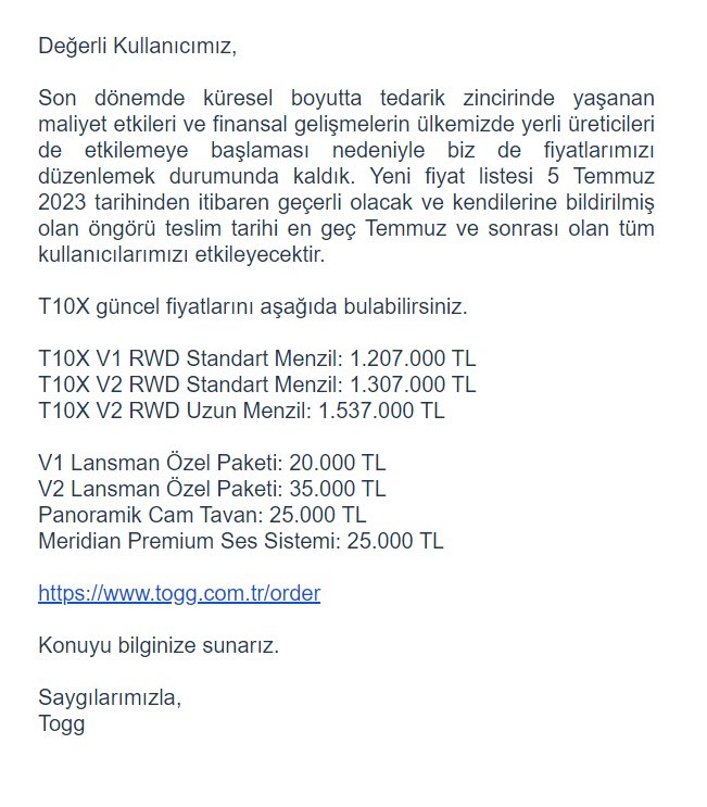 Gazete Pencere yazarı Emre Özpeynirci Twitter hesabından yaptığı paylaşımda TOGG modellerine zam geldiğini duyurdu. Özpeynirci'nin TOGG'a gelen zamları şu ifadelerle duyurdu: