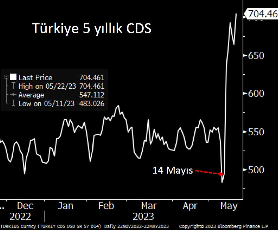 "14 Mayıs sonrası Türkiye’nin CDS’i 494’ten 704’e yükseldi. Yani dış borcun ödenememe (iflas) olasılığı kabaca %20’den %30’a çıktı."