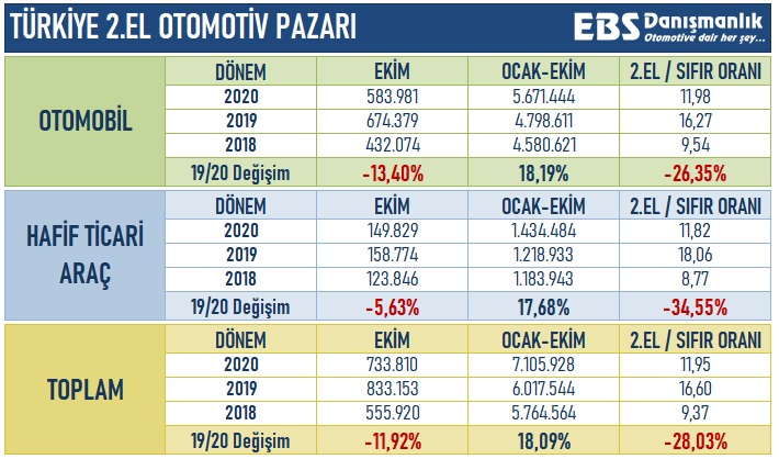 “2. el otomobil pazarı ekim ayında eylüle göre de yüzde 9,82 düşerek 584 bin adede geriledi. İlk 10 aylık dönemde ise sıfır otomobil pazarı yüzde 75 artarken, 2.el otomobil pazarı ise sadece yüzde 18,2 oranında büyüyerek 5.6 milyon adedi aştı. 2019 yılı ilk 6 aylık dönemde yeni araç satışlarında hurda, ÖTV ve KDV teşvikinin olduğunu da unutmamak gerekiyor. Ekim ayında 2. el hafif ticari araç pazarı ise 2019 yılına göre yüzde 6,47 düşüşle 150 bin adede gerilerken, yılın ilk 10 ayında yüzde 17,68 oranında büyüme ile pazar 1.4 milyon adete ulaştı.”
