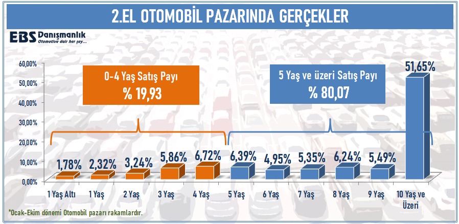 10 ay sonunda 2.el otomotiv pazarında satışların sadece yüzde 19.93’ü 0-4 yaş arası araçlardan oluşurken, yüzde 80.07’si 5 yaş ve üzeri ikinci el araç satışlarından oluştu. Satışlarda en büyük paya ise yüzde 51.65 ile 10 yaş ve üzeri araçlar sahip. Bu da aslında Türkiye’de alım gücünü net olarak ortaya koyuyor.