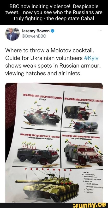 BBC’nin Ortadoğu Büro Şefi Jeremy Bowen da Ukrayna’daki savaşı izleyen gazetecilerden. Twitter’da “Ukraynalı gönüllü savaşçılar” için hazırlanan bir görseli paylaştı. Molotof kokteylinin Rusya tankları ve zırhlı araçlarının neresine atılırsa daha etkili olacağı, araç fotoğrafları üzerinde çizimlerle anlatılıyordu.