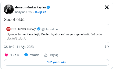 Ünlü oyuncu sosyal medya hesabından yaptığı paylaşımda, Tamer Karadağlı’ya, tiyatro dünyasının gözde oyunlarından “Godot’u beklerken” ile göndermede bulundu. Taylan, Karadağlı’nın atamasına ilişkin paylaşılan bir haberi alıntılayarak “Godot öldü” dedi.