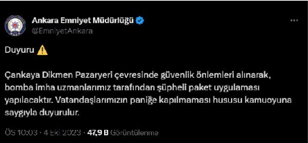 Aankara'nın Çankaya ilçesinde pazar yerinde bulunan sahipsiz paket endişe yarattı. Çevre güvenliği alınarak fünye ile patlatılan paket boş çıktı.