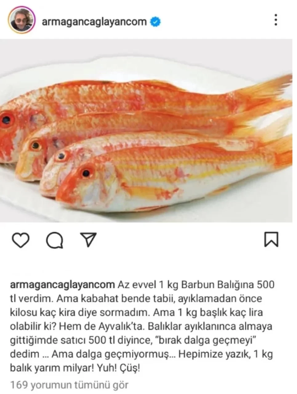 Armağan Çağlayan, bir kilo barbun balığına verdiği fiyata isyan etti. Çağlayan, barbunun fotoğrafını paylaşarak tepki gösterdi.
