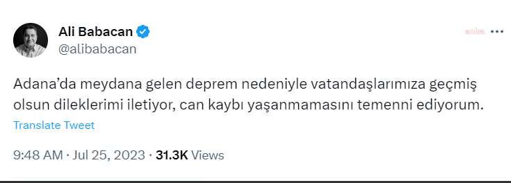 “Adana’da meydana gelen deprem nedeniyle vatandaşlarımıza geçmiş olsun dileklerimi iletiyor, can kaybı yaşanmamasını temenni ediyorum.”