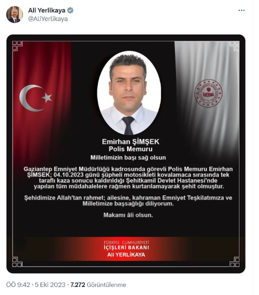 Bakan Yerlikaya, sosyal medya hesabından yaptığı açıklamada, "Milletimizin başı sağ olsun. Gaziantep Emniyet Müdürlüğü kadrosunda görevli Polis Memuru Emirhan Şimsek; 04 Ekim 2023 günü şüpheli motosikleti kovalamaca sırasında tek taraflı kaza sonucu kaldırıldığı Şehitkamil Devlet Hastanesi'nde yapılan tüm müdahalelere rağmen kurtarılamayarak şehit olmuştur. Şehidimize Allah'tan rahmet; ailesine, kahraman Emniyet Teşkilatımıza ve milletimize başsağlığı diliyorum. Makami ali olsun" dedi.