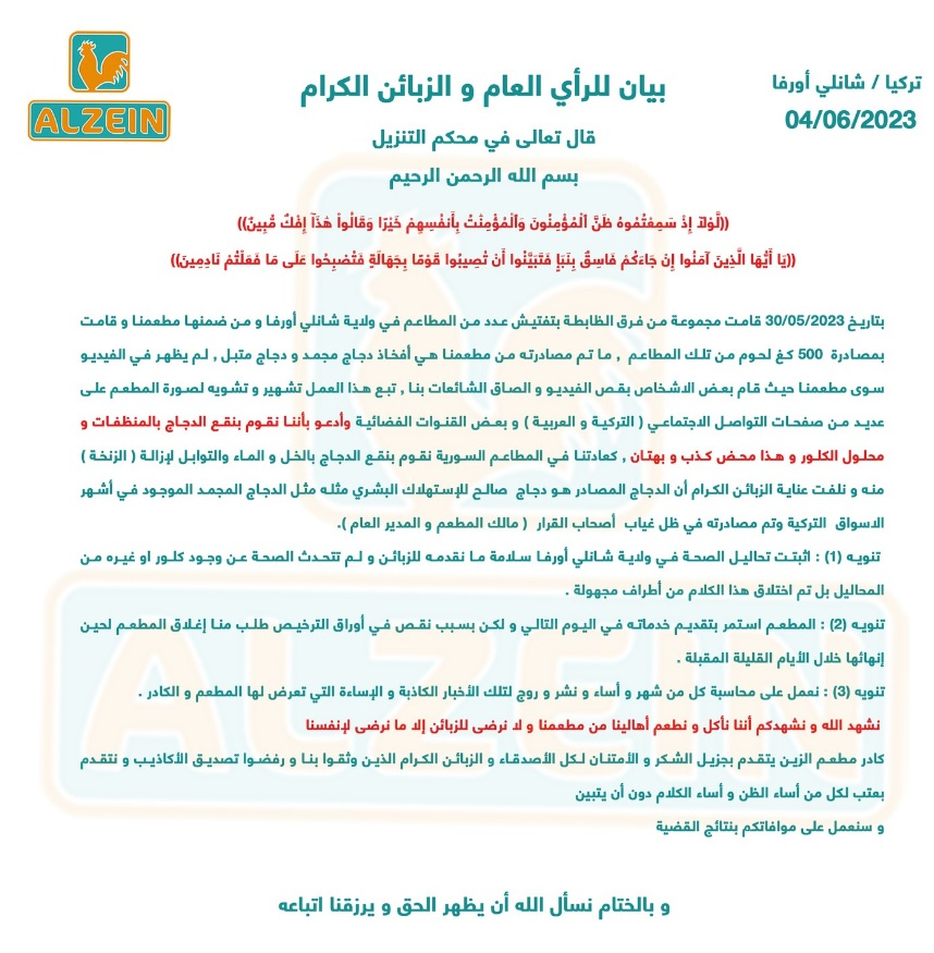Arapça yapılan açıklamada 500 kilo tavuk etine el konulduğu doğrulanırken, tavuğun çamaşır suyuyla yıkandığı iddiaları ise yalanlandı. Diğer yandan açıklamada zabıta ve polis ekiplerinin 500 kilo tavuğa el koydukları sırada “karar vericiler” olarak tanımladıkları restoran sahibi ve genel müdürün orada olmadığı vurgulandı. Suriye restoranlarında her zaman yapıldığı gibi sirke, su ve baharatla yıkadıklarını belirten eden firma ayrıca Şanlıurfa’daki laboratuvarlarda yaptırdıkları analizlerin temiz çıktığını de herhangi bir uygunsuzluk olmadığını söyledi. Firmanın kamuoyuna ve tüm “seçkin” müşterilerine yaptığı açıklamada ayrıca firmalarının ve personellerinin istismara maruz kaldığını belirtirken, yalanlara inanmayan tüm dürüst ve seçkin müşterilerine de teşekkür edildi.