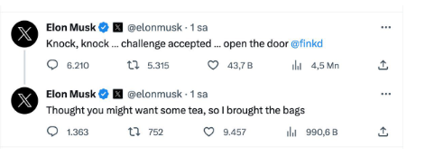 X’in sahibi Elon Musk, X (eski adıyla Twitter) hesabından yaptığı paylaşımda Facebook’un kurucusu Mark Zuckerberg'e yönelik “Kapıyı aç Mark, çay getirdim“ sözleriyle paylaşım yaptı.