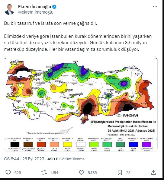 İmamoğlu, sosyal medya hesabından kuraklığa dikkat çekti. “Bu bir tasarruf ve israfa son verme çağrısıdır” diyen İmamoğlu, Türkiye’nin kuraklık haritasını da paylaştı. Haritaya göre İstanbul’un büyük bir kısmı ‘olağanüstü kurak’ bölgede.