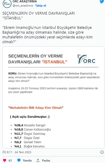 ORC Araştırma, yaptığı araştırmada İBB Başkanı Ekrem İmamoğlu’nun aday olması durumunda kimi aday olarak görmek istediklerini sordu. Katılımcıların yüzde 36.4’ü Mustafa Sarıgül cevabını verdi.
