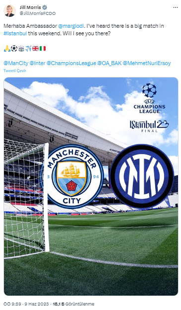 UEFA Şampiyonlar Ligi Finali'nde Manchester City ile Inter bugün İstanbul Atatürk Olimpiyat Stadı'nda karşılaşacak. İngiltere'nin Ankara Büyükelçisi Jill Morris, İtalyan mevkidaşı Giorgio Marrapodi'yi İstanbul'daki maça davet etti.