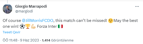 Büyükelçi Marrapodi, "Forza Inter" diyerek ülkesinin takımına destek verdi.