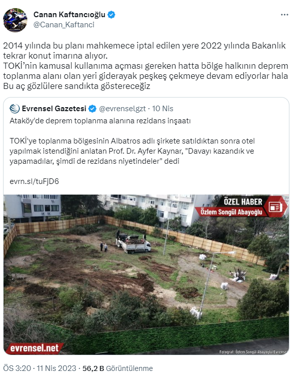“2014 yılında bu planı mahkemece iptal edilen yere 2022 yılında Bakanlık tekrar konut imarına alıyor. TOKİ’nin kamusal kullanıma açması gereken, hatta bölge halkının deprem toplanma alanı olan yeri giderayak peşkeş çekmeye devam ediyorlar hala. Bu aç gözlülere sandıkta göstereceğiz.” (ANKA)