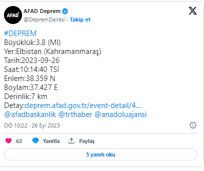 İçişleri Bakanlığı Afet ve Acil Durum Yönetimi Başkanlığı (AFAD), saat 10.14'te Kahramanmaraş'ın Elbistan ilçesinde 3.8 büyüklüğünde bir deprem meydana geldiğini duyurdu.