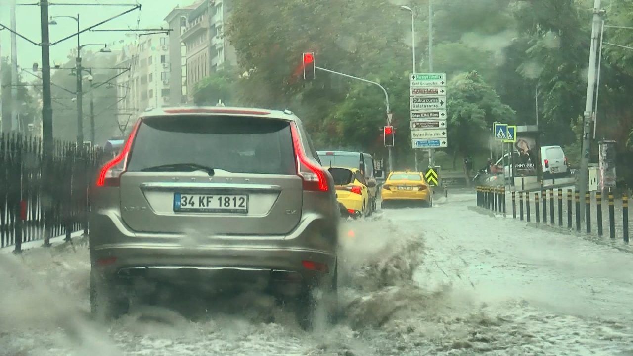Araçlar kaldırım seviyesine kadar ulaşan su birikintisi içinde Galata Köprüsü yönüne doğru ilerlemekte güçlük çekti.