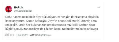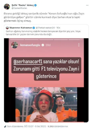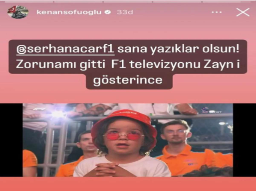 "Daha saçma ne olabilir diye düşünüyorum her gün daha saçma olaylarla karşılaşıyorum. Kenan Sofuoğlu, Zayn'ın anons edilmesini istemiş ama orası pist. Orada her bulunan tanınmak zorunda mı? Belki Serhan Acar küçük çocuğu tanımadı ya da gözden kaçtı. Ne bu üstten bakış anlayışı!"