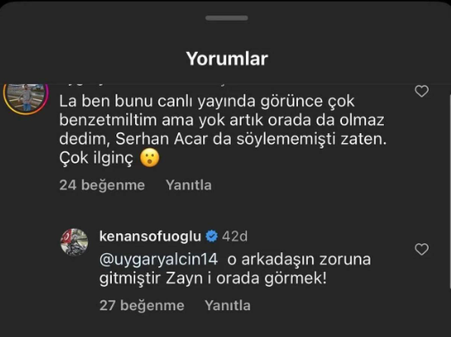 Sofuoğlu daha sonra bir takipçisinin yorumuna da "O arkadaşın zoruna gitmiştir Zayn'ı orada görmek" yanıtını verdi.