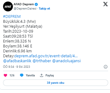 T.C. İçişleri Bakanlığı Afet ve Acil Durum Yönetimi Başkanlığı (AFAD), saat 09.28'de, merkez üssü Malatya'nın Yeşilyurt ilçesi olan 4.3 büyüklüğünde bir deprem meydana geldiğini duyurdu.