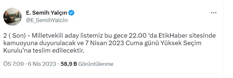 "Milletvekili aday listemiz bu gece 22.00 ‘da EtikHaber sitesinde kamuoyuna duyurulacak ve 7 Nisan 2023 Cuma günü Yüksek Seçim Kurulu’na teslim edilecektir."