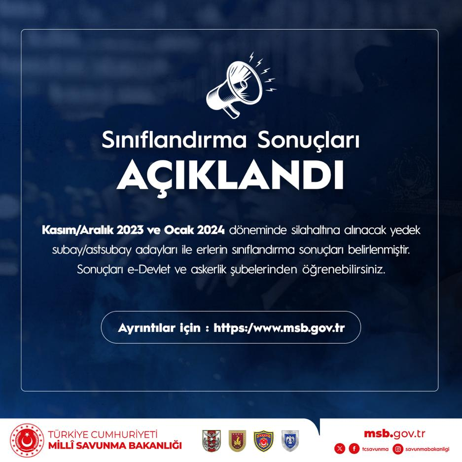 Kasım/Aralık 2023 ve Ocak 2024 döneminde silahaltına alınacak yedek subay/astsubay adayları ile erlerin sınıflandırma sonuçları belirlenmiştir. Sonuçları e-Devlet ve askerlik şubelerinden öğrenebilirsiniz.