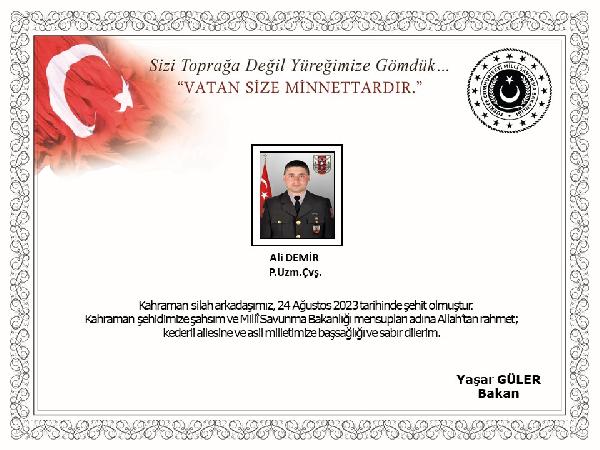 Bakanlıktan yapılan yazılı açıklamada, "Pençe-Kilit Operasyonu bölgesinde, 24 Ağustos 2023 tarihinde bir üs bölgesinden yol emniyetine çıkan unsurlara bölücü terör örgütü mensuplarınca açılan taciz ateşi sonucunda kahraman silah arkadaşımız Piyade Uzman Çavuş Ali Demir ağır yaralanmış ve kaldırıldığı hastanede yapılan tüm müdahalelere rağmen kurtarılamayarak şehit olmuştur. Bizleri derin bir acı ve üzüntüye boğan bu olayda hayatını kaybeden aziz şehidimize Allah'tan rahmet, kederli ailesine, Türk Silahlı Kuvvetleri ile asil milletimize başsağlığı ve sabır dileriz" denildi.