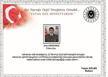 Milli Savunma Bakanlığı, Pençe-Kilit Harekâtı bölgesinde dün helikopter palinin çarpması sonucu yaralanan Piyade Uzman Çavuş Enes Kırmızıkoç'un şehit olduğunu bildirdi.