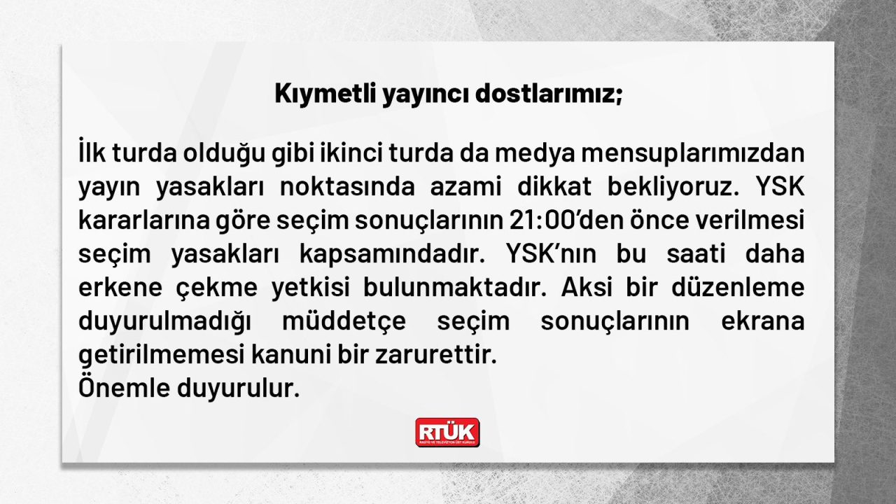 Şahin, Twitter üzerinden yaptığı paylaşımda "medyadan azami dikkat beklediklerini" ifade etti ve "Seçim sonuçlarının 21.00'den önce verilmesi yasak kapsamındadır" denildi.