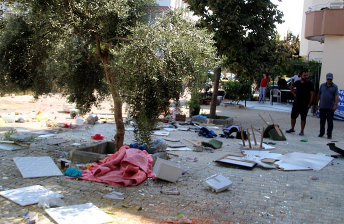 Çevredekilere hakaretler yağdıran Ş.Ö., daha sonra mutfaktaki eşyaları kırdığı pencereden eşyaları atmaya başladı.