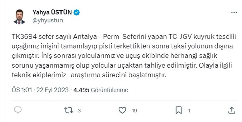 Konuyla ilgili olarak sosyal medya hesabından bir açıklama yapan THY Basın Müşaviri Yahya Üstün, "İniş sonrası yolcularımız ve uçuş ekibinde herhangi sağlık sorunu yaşanmamış olup yolcular uçaktan tahliye edilmiştir. Olayla ilgili teknik ekiplerimiz araştırma sürecini başlatmıştır" denildi.