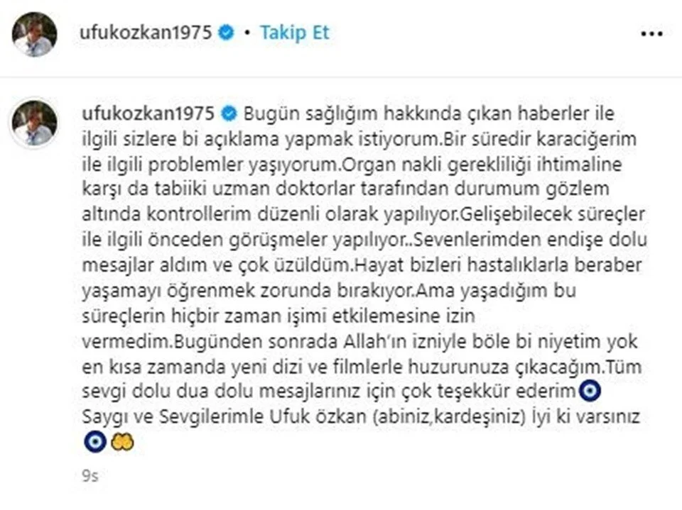 "Bugün sağlığım hakkında çıkan haberler ile ilgili sizlere bir açıklama yapmak istiyorum. Bir süredir karaciğerim ile ilgili problemler yaşıyorum. Organ nakli gerekliliği ihtimaline karşı da tabii ki uzman doktorlar tarafından durumum gözlem altında kontrollerim düzenli olarak yapılıyor. Gelişebilecek süreçler ile ilgili önceden görüşmeler yapılıyor. Sevenlerimden endişe dolu mesajlar aldım ve çok üzüldüm. Hayat bizleri hastalıklarla beraber yaşamayı öğrenmek zorunda bırakıyor. Ama yaşadığım bu süreçlerin hiçbir zaman işimi etkilemesine izin vermedim. Bugünden sonrada Allah’ın izniyle böyle bir niyetim yok en kısa zamanda yeni dizi ve filmlerle huzurunuza çıkacağım. Tüm sevgi dolu dua dolu mesajlarınız için çok teşekkür ederim.