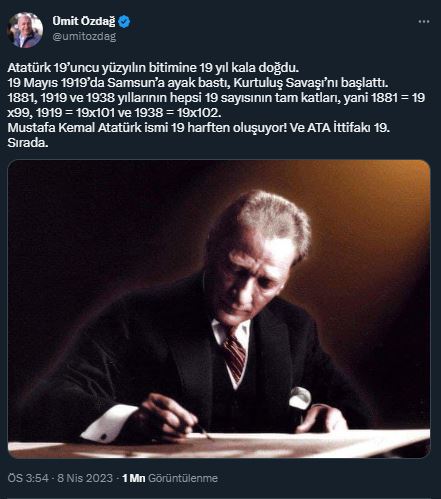 “Atatürk 19’uncu yüzyılın bitimine 19 yıl kala doğdu. 19 Mayıs 1919’da Samsun’a ayak bastı, Kurtuluş Savaşı’nı başlattı. 1881, 1919 ve 1938 yıllarının hepsi 19 sayısının tam katları, yani 1881 = 19 x99, 1919 = 19x101 ve 1938 = 19x102. Mustafa Kemal Atatürk ismi 19 harften oluşuyor! Ve ATA İttifakı 19. Sırada.”