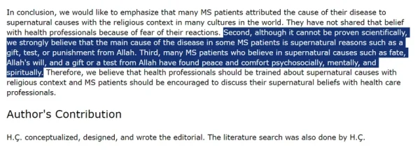 “MS hastalığının doğaüstü nedenleri vardır. MS hastaları, Allah tarafından cezalandırıldıkları ya da sınava çekildikleri içim hastadırlar” ifadeleri kamuoyundan tepki topladı.
