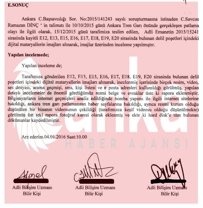 IŞİD’in 10 Ekim Ankara Tren Garı katliamı ile ilgili iddianamede yer alan bazı belgeleri, Ankara Cumhuriyet Başsavcılığı’nın talimatı ile “bilirkişi” sıfatıyla iki istihbarat polisinin incelediği ortaya çıktı. IŞİD’in Gaziantep emiri Yunus Durmaz’a ait belgelerin incelenmesi sonucu hazırlanan iddianameyi inceleyen polisler arasında eski İstihbarat Dairesi Başkan Yardımcısı K.A.’ın da olduğu görüldü. A.’nın, Trabzon merkezli “kripto para vurgunu” soruşturması kapsamında “dolandırıcılık” suçlamasıyla ifade verdiği öğrenildi. “Kripto para” soruşturmasından yaklaşık iki yıl sonra A.’nın emeklilik işlemlerini başlattığı belirtildi.