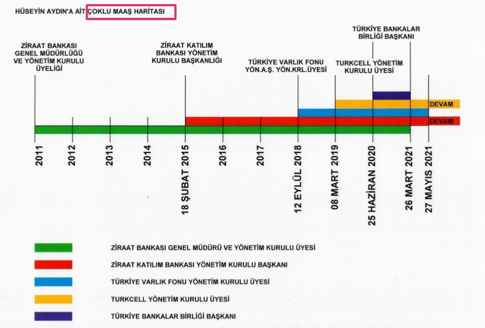 3-Hüseyin Aydın – Aylık Ortalama Gelir: 74.000 TL – Mevcut görevler: Turkcell YK Üyesi (ücret), Ziraat Katılım Bankası YK Başkanı (ücret) Eski Görevler: Eski Ziraat Bankası Genel Müdürü, Eski Türkiye Varlık Fonu YK Üyesi, Türkiye Bankalar Birliği YK Başkanı