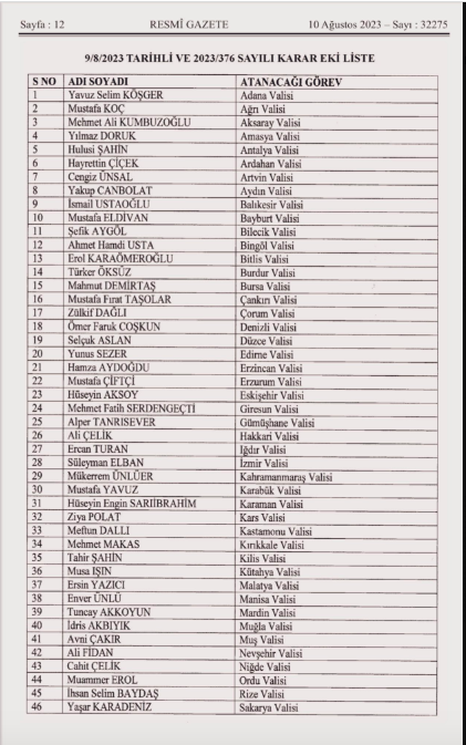 Resmi Gazate'de yayımlanan atama kararlarına göre Adana Valisi Süleyman Elban, İzmir Valiliğine; Malatya Valisi Hulusi Şahin, Antalya Valiliğine; Mardin Valisi Mahmut Demirtaş, Bursa Valiliğine; Tekirdağ Valisi Aziz Yıldırım, Trabzon Valiliğine atandı.