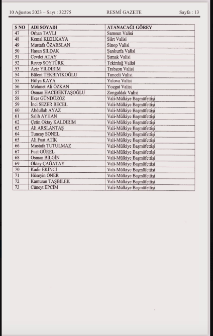 Resmi Gazete'de yayımlanan Valiler Kararnamesi'ne göre 57 ile yeni vali atandı.