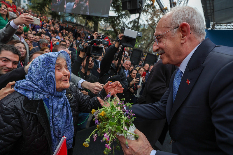Daha sonra Kılıçdaroğlu, “Yaş 89 ama gönül dağlarda geziyor” diyerek yüzleri güldüren teyzenin yanına giderek elindeki çiçekleri aldı. Kılıçdaroğlu’nun, teyzenin elini öpmek istediği görüldü.