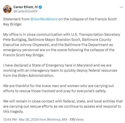 “Francis Scott Key Köprüsü'nün çöküşünün ardından acil durum personeli olay yerinde olduğundan ofisim ABD Ulaştırma Bakanı Pete Buttigieg, Baltimore Belediye Başkanı Brandon Scott, Baltimore İlçe Yöneticisi Johnny Olszewski ve Baltimore İtfaiye Departmanı ile yakın iletişim halindedir.